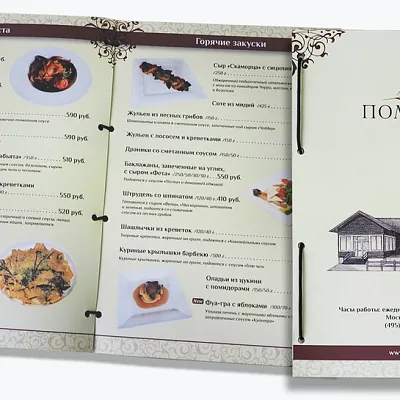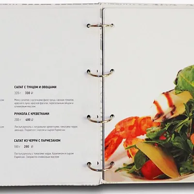 Мы печатаем меню в виде ламинированных листов, буклетов, многостраничных каталогов, меню на пружине, в папках или с дизайнерской обложкой. Возможны форматы А4, А5, евро, нестандартные размеры и индивидуальная высечка.