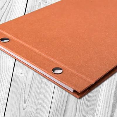 • В таком меню листы и обложка скрепляются с помощью коротких металлических болтов. Они вкручиваются в отверстия на переплете и плотно фиксируют страницы. Крепление подходит для малого числа страниц: в таком формате выпускают не только основное меню, но также карты напитков и сезонных предложений.