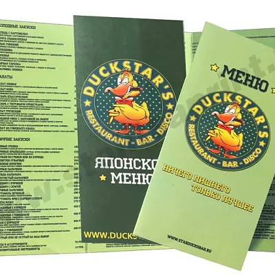 Изготавливается из бумаги 300гр, печать 4+4. Дополнительно: ламинация, уф-лак, тиснение. Цена указана за меню с обложкой 300гр, блок 150гр, скрепление на скобу.