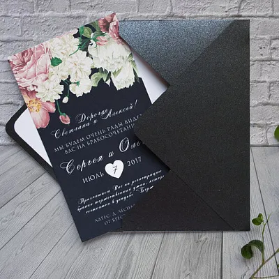 Для пригласительных мы используем цифровую и офсетную печать, а также шелкографию, тиснение фольгой, конгрев, выборочный лак, вырубку. Возможна печать на дизайнерских бумагах и картонах с различной текстурой.